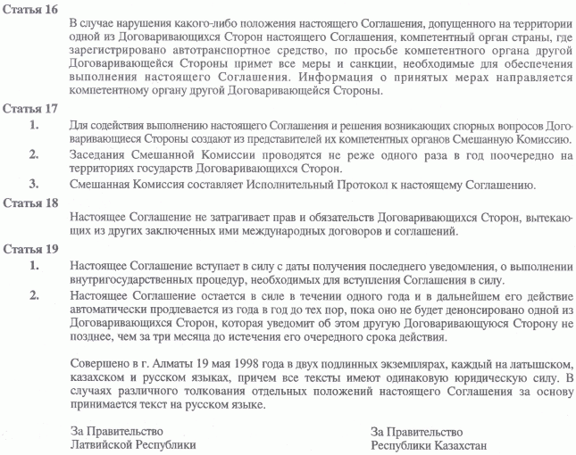 Parakstīts Almati 1998. gada 19. maijā divos oriģināleksemplāros, katrs no tiem latviešu, kazahu un krievu valodā, turklāt visiem tekstiem ir vienāds juridisks spēks. Dažādas interpretācijas gadījumā noteicošais ir Nolīguma teksts krievu valodā.