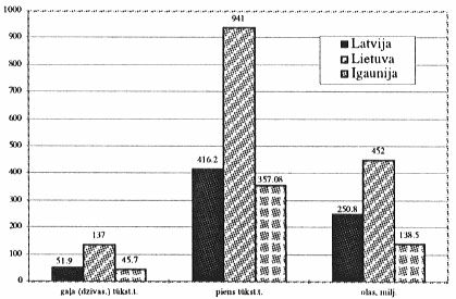 1996. gadā Latvijā viens lauksaimniecībā nodarbinātais deva ieguldījumu IKP Ls 1387,21 vērtībā. Tas bija par 12 procentiem mazāk nekā Igaunijā un par 5,5 procentiem vairāk nekā Lietuvā. Sarežģījumus aprēķinos rada fakts, ka Igaunijas Statistikas komiteja savos izdevumos neuzrāda nodarbināto skaita sadalījumu nozaru griezumā.