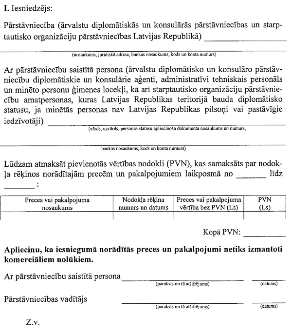 Iesniegums pievienotās vērtības nodokļa atmaksāšanai ārvalstu diplomātiskajām un konsulārajām pārstāvniecībām un starptautisko organizāciju pārstāvniecībām Latvijas Republikā, un ar šīm pārstāvniecībām saistītām personām