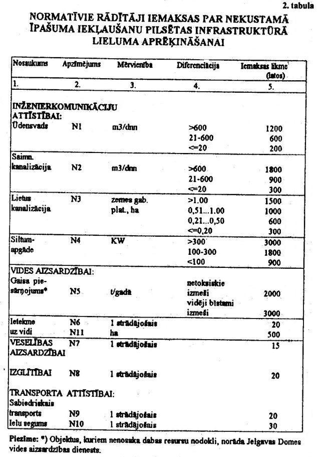 Noteikt, ka ikviens uzņēmējs (juridiska vai fiziska persona), kas vēlas Jelgavas pilsētas teritorijā realizēt attīstības priekšlikumu (būvniecības, rekonstrukcijas, modernizācijas u.c.) Jelgavas Domes noteiktajā kārtībā, neatkarīgi no zemes īpašuma piederības veic vienreizēju iemaksu par pilsētas infrastruktūras (labiekārtošanas objektu, inženiertehnisko būvju un tīklu, parku, apstādījumu, transporta tīkla un būvju u.c., kā arī sociālo, veselības, izglītības u.c. iestāžu pakalpojumu) izmantošanu, un tās apjoms tiek aprēķināts pēc 1.-4. tabulā noteiktās metodikas.