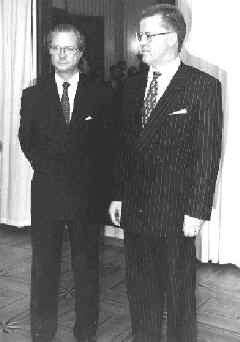 Viņa Majestāte Zviedrijas karalis (kopš 1973.gada) Kārlis XVI Gustavs, kas šodien svin savu 50. dzimšanas dienu, Rīgā 1994.gada 8.novembrī bija klāt Ekonomikas augstskolas atklāšanā (attēlā), apmeklēja Valsts prezidenta Gunta Ulmaņa rezidenci, ieradās vizītē pie toreizējā Saeimas priekšsēdētāja Anatolija Gorbunova. Karalis ir Bernadotu dinastijas pārstāvis, karaļa Gustava VI Ādolfa (1950 — 1973) mazdēls. (Skat. arī 8.lpp. ) Foto: Māris Kaparkalējs, “LV”