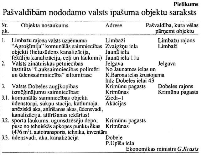 Saskaņā ar likuma “Par valsts uzņēmumu” (Latvijas Republikas Augstākās Padomes un Valdības Ziņotājs, 1991, 1./2., 13./14.nr.; 1992, 29./31.nr.; 1993, 22./23.nr.; Latvijas Vēstnesis, 1994, 96.nr.; 1995, 162.nr.) 11.pantu nodot attiecīgo pašvaldību īpašumā valsts īpašuma objektus, kas atrodas Zemkopības ministrijas pārziņā esošo valsts uzņēmumu valdījumā (pielikums).