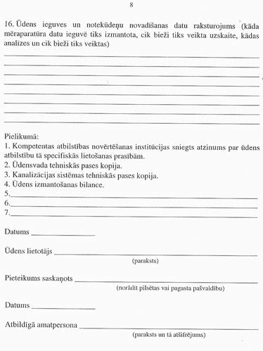 18. Ja atļauja nepieciešama jaunbūvēta objekta īpašniekam, to izsniedz pirms attiecīgā objekta nodošanas ekspluatācijā. Ierīkojot jaunu urbumu, dziļāku par 20 m, nepieciešama Ģeoloģijas dienesta izdota urbuma pase. Ja ūdens nepieciešams objekta celtniecības laikā, reģionālā vides pārvalde izsniedz īstermiņa atļauju.