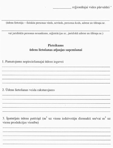 5. Atļaujas pieprasītājs reģionālajai vides pārvaldei iesniedz ar pagasta vai pilsētas pašvaldību saskaņotu aizpildītu pieteikumu ūdens lietošanas atļaujas saņemšanai (turpmāk - pieteikums) (1.pielikums), kas ir obligāts nosacījums atļaujas saņemšanai. Pieteikumā atbilstoši ūdens lietošanas veidam sniedzamas šādas ziņas un pievienojami attiecīgi dokumenti: