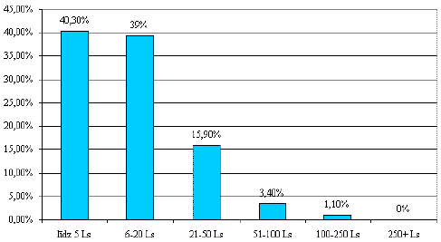 Grupējot datus par vienā reizē nepieciešamo maksājumu summām šajā iestādē, redzam, ka pārsvarā tas ir kukulis līdz 20Ls vērtībai, bet visizplatītākā summa - 6 - 20Ls (64.zīm.).