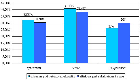 Grupējot pozitīvās un negatīvās atbildes, varam secināt, ka ar Ceļu policijas attieksmi pret pakalpojumu kvalitāti un apkalpošanas ātrumu aptaujātie pārsvarā ir neapmierināti, jo gandrīz puse respondentu nav apmierināti ar pakalpojumu kvalitāti, bet katrs trešais - ar apkalpošanas ātrumu (65.zīm.).