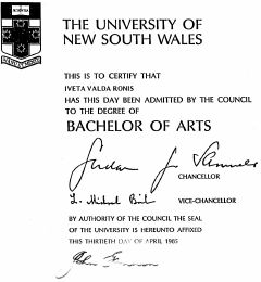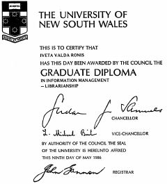 Par autori: Iveta Rone Austrālijā ir Jaundienvidvelsas pavalsts tehnisko koledžu bibliotēku datoru sistēmu vadītāja. Te ietilpst 103 koledžu bibliotēkas. Pēc studijām Jaundienvidvelsas universitātē I.Rone ieguva humanitāro zinātņu grādu. Taču, lai būtu plašākas darba iespējas, viņa šajā pašā universitātē 1986.gadā ieguva zinātnisko grādu bibliotēku zinībās. (Abu diplomu kopijas publicējam.) Austrālijā pētniece uzstājusies ar vairākiem zinātniskiem referātiem un publicējusies.