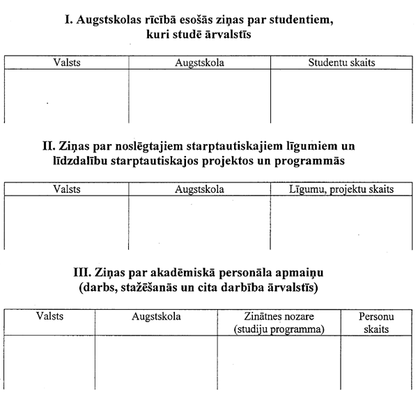 Ministru kabineta 2001. gada 14. augusta noteikumi Nr. 368 "Kārtība un termiņš, kādā augstskolas iesniedz Izglītības un zinātnes ministrijā informāciju par savu darbību". Publicēts oficiālajā laikrakstā "Latvijas Vēstnesis", 17.08.2001., Nr. 119 https://www.vestnesis.lv/ta/id/53238