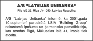 Iepazīšanās ar izsoles noteikumiem un dalībnieku reģistrācija - darba dienās līdz 2001.gada 16.oktobrim no pulksten 10 līdz 16 zērinātu advokātu birojā "Centrs" Rīgā, Brīvības ielā 52 - 4. Tālrunis uzziņām 7282901, 7283667.