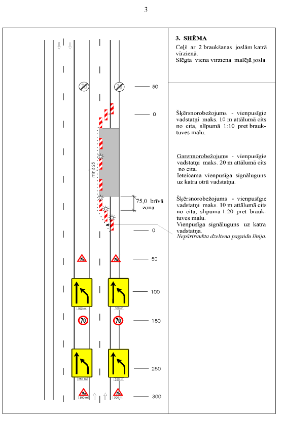 94.1. ja satiksmes intensitāte nav lielāka par 5000 automobiļiem diennaktī, īslaicīgo stacionāro darbu vietas šķērsnorobežojumam var izmantot vadkonusus. Darba vietas garums nedrīkst pārsniegt 50 m, un satiksmei izmantojamās brauktuves platums gar darba vietu ir vismaz 5,5 m. Šķērsnorobežojumam uzstāda vismaz trīs vadkonusus slīpumā 1:3 līdz 1:2 pret brauktuves malu ne tālāk kā 2 m citu no cita (3.pielikuma 6.shēma);