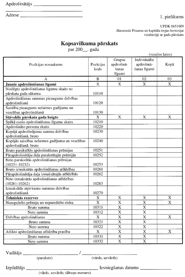 3.1.1. “Kopsavilkuma pārskata par dzīvības apdrošināšanu” (UPDK 0651010 veidlapa; 2. pielikuma 1. lapa);