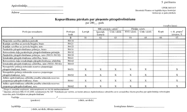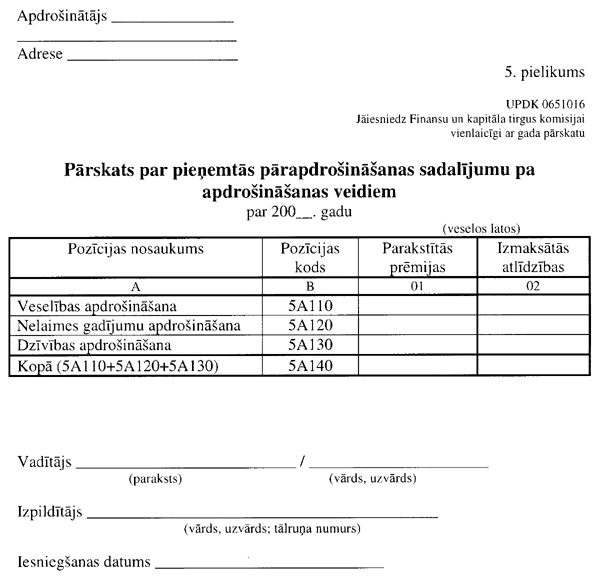 3.2.1. “Pārskata par pieņemtās pārapdrošināšanas sadalījumu pa apdrošināšanas veidiem” (UPDK 0651016 veidlapa; 5. pielikuma 2. lapa);