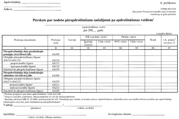 3.3.1.”Pārskata par nodoto pārapdrošināšanu sadalījumā pa apdrošināšanas veidiem” (UPDK 0651018 veidlapa; 6. pielikuma 2. lapa);