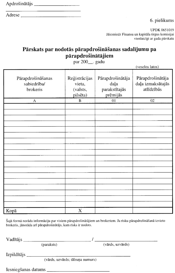 3.3.2. “Pārskata par nodotās pārapdrošināšanas sadalījumu pa pārapdrošinātājiem” (UPDK 0651019 veidlapa; 6. pielikuma 3. lapa);