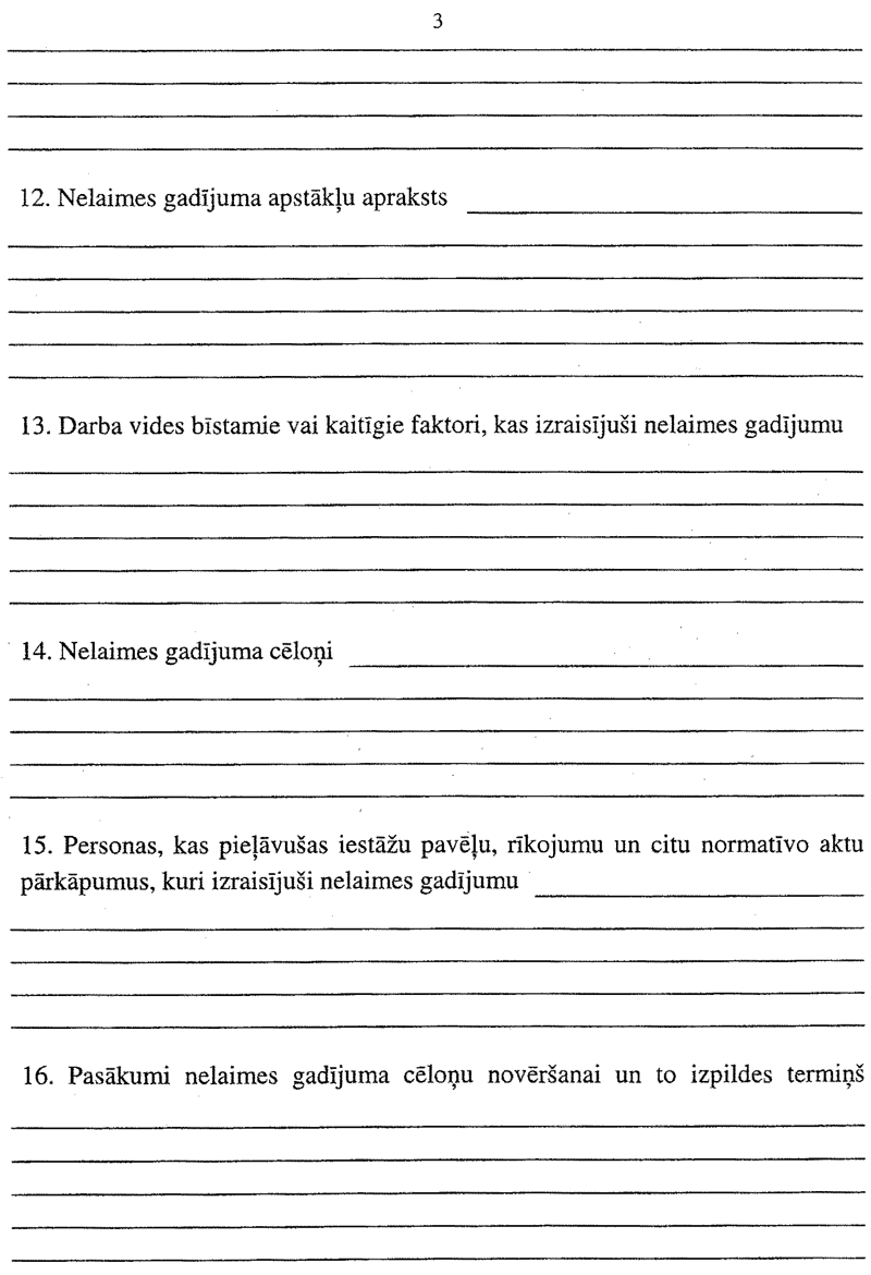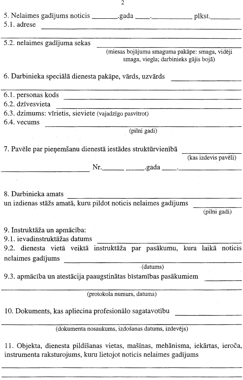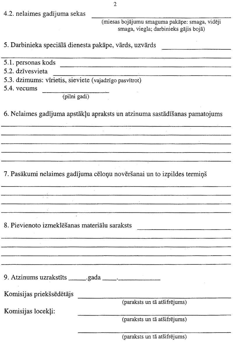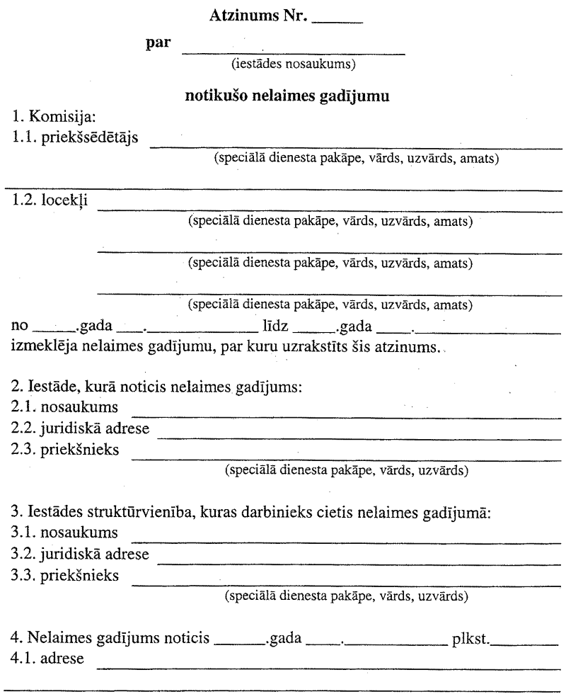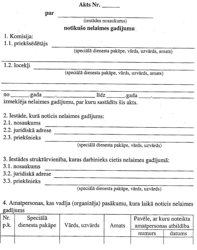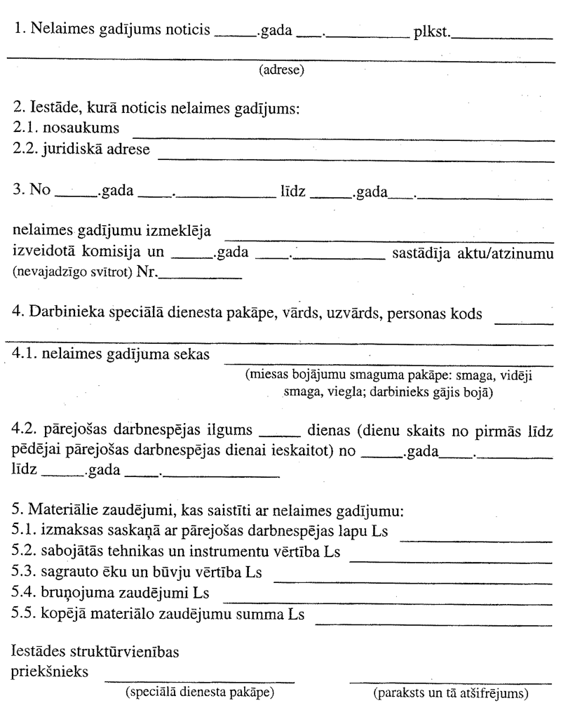 Datums, kad par nelaimes gadījumu sastādīts | Darbinieka speciālā dienesta pakāpe, vārds, uzvārds, personas kods | Iestādes nosaukums, darbinieka amats | Datums, kad noticis nelaimes gadījums | Īss nelaimes gadījuma un tā cēloņu apraksts | Nelaimes gadījuma sekas | |