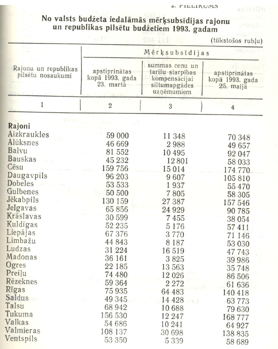 2. Grozīt 1993. gada valsts budžeta izdevumus par kopējo palielinājuma summu — 515 986 tūkstošiem rubļu saskaņā ar pielikumiem, tajā skaitā palielināt mērķsubsīdijas rajonu un republikas pilsētu budžetiem par 515 986 tūkstošiem rubļu cenu un tarifu starpības kompensācijai siltumapgādes uzņēmumiem. Rajonu un republikas pilsētu pašvaldībām šos līdzekļus pirmām kārtām novirzīt parāda segšanai valsts uzņēmumam «Materiālās rezerves».