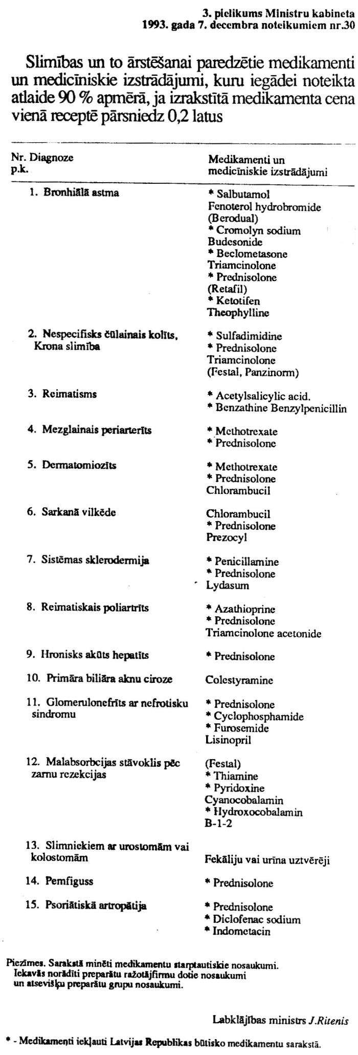 2. Ambulatorajai ārstēšanai nepieciešamie medikamenti un medicīniskie izstrādājumi visiem iedzīvotājiem jāiegādājas par pilnu maksu, ja vienā receptē izrakstītā medikamenta daudzuma vērtība nepārsniedz 0,2 latus. (Izņēmums — cukura diabēta slimnieki, kuriem parenterāli ievadāmais insulīns izsniedzams bez maksas.) Vienā receptē drīkst izrakstīt medikamenta daudzumu, kas paredzēts maksimāli divu mēnešu ārstēšanās kursam.