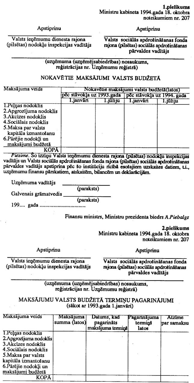 5.6. Valsts ieņēmumu dienesta rajona (pilsētas) nodokļu inspekcijas un Valsts sociālās apdrošināšanas fonda rajona (pilsētas) sociālās apdrošināšanas pārvaldes apstiprināta izzina par nokavētajiem maksājumiem valsts budžetā (1. pielikums) un izzina par maksājumu valsts budžetā termiņu pagarinājumiem (2. pielikums);
