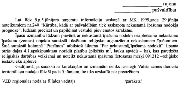 Lai Valsts zemes dienests atbilstoši MK 1999.gada 29.jūnija noteikumiem Nr.240 "Kārtība, kādā ar pašvaldībām tiek saskaņota nekustamā īpašuma nodokļa prognoze" līdz 2000.gada 15.jūlijam Finansu ministrijā iesniegtu ar nekustamā īpašuma nodokli apliekamo nekustamo īpašumu (zemes) kadastrālo vērtību kopsummas, nosaku: