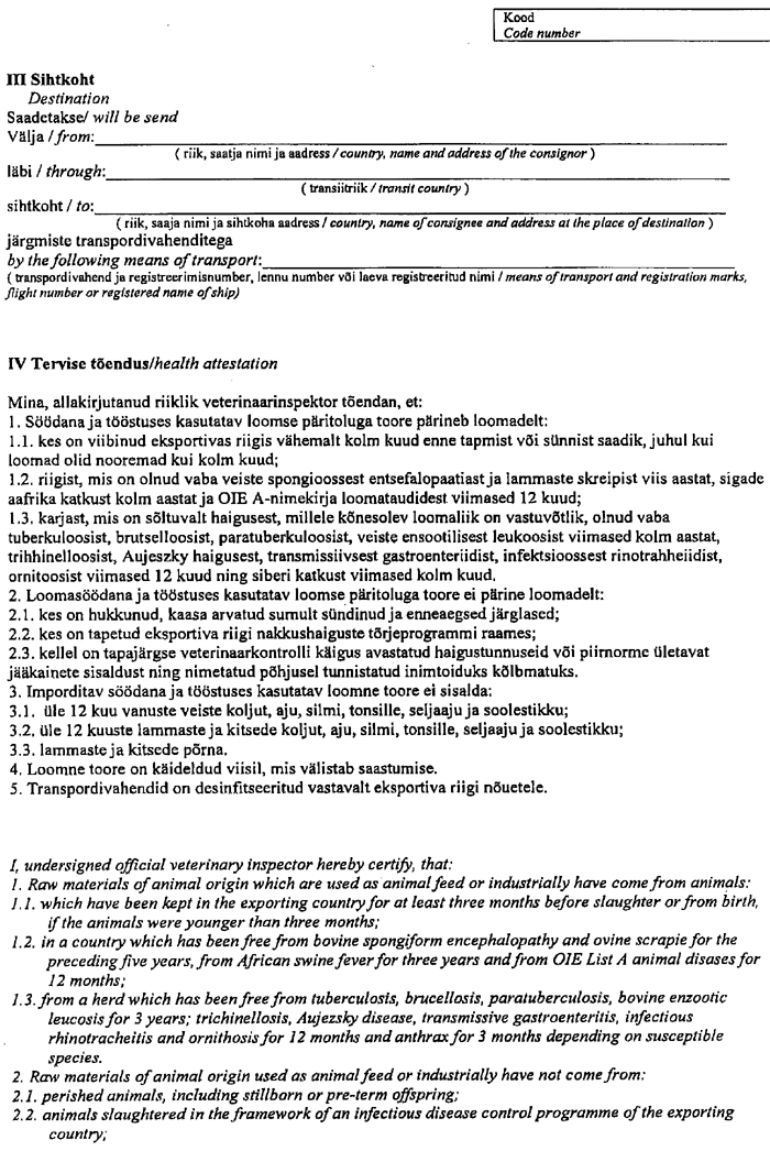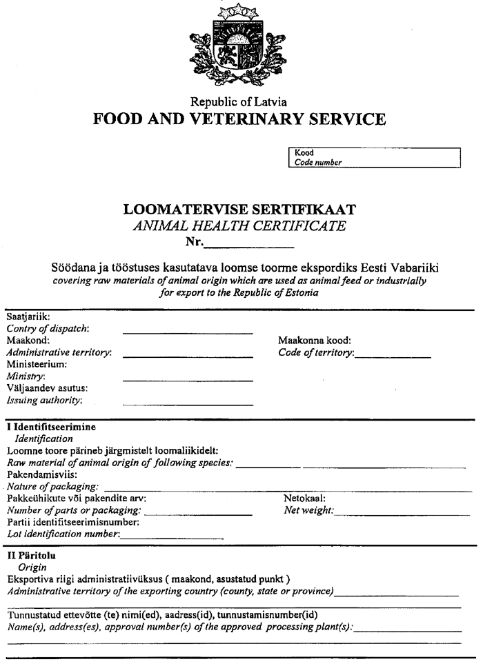 1. Neapstrādātu dzīvnieku izcelsmes izejvielu, kas paredzētas lietošanai dzīvnieku barībā vai rūpnieciskām vajadzībām, izvešanai uz Igaunijas Republiku izsniegt rīkojuma pielikumā noteiktā parauga veterināro sertifikātu.
