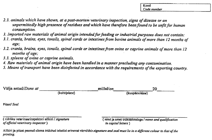 2. Atcelt sertifikāta “Eksport 2” izsniegšanu neapstrādātu dzīvnieku izcelsmes izejvielu, kas paredzētas lietošanai dzīvnieku barībā vai rūpnieciskām vajadzībām, izvešanai uz Igaunijas Republiku.
