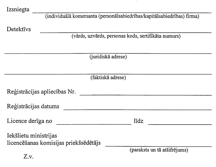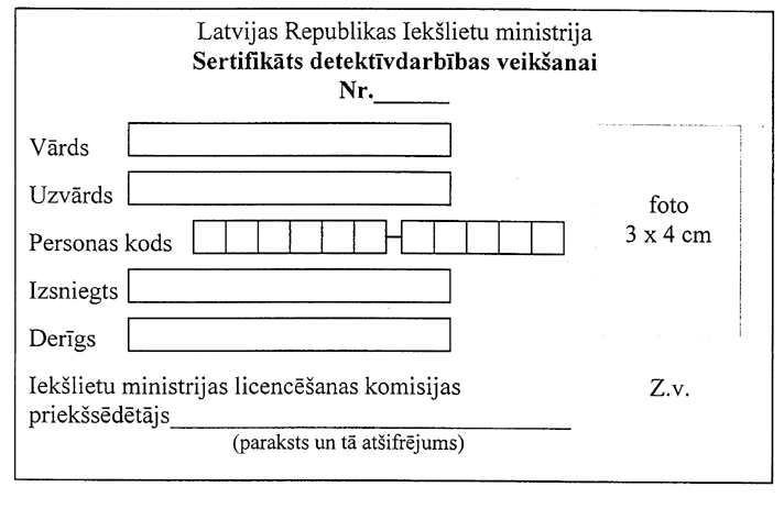 Piezīme. Sertifikāta izmērs ir 100 x 75 mm, fons - gaiši brūnā krāsā, vieta detektīva vārdam, uzvārdam un personas kodam, sertifikāta izsniegšanas datumam un derīguma termiņa beigu datumam - baltā krāsā, teksts - melnā krāsā. Sertifikāts ir ievalcēts.