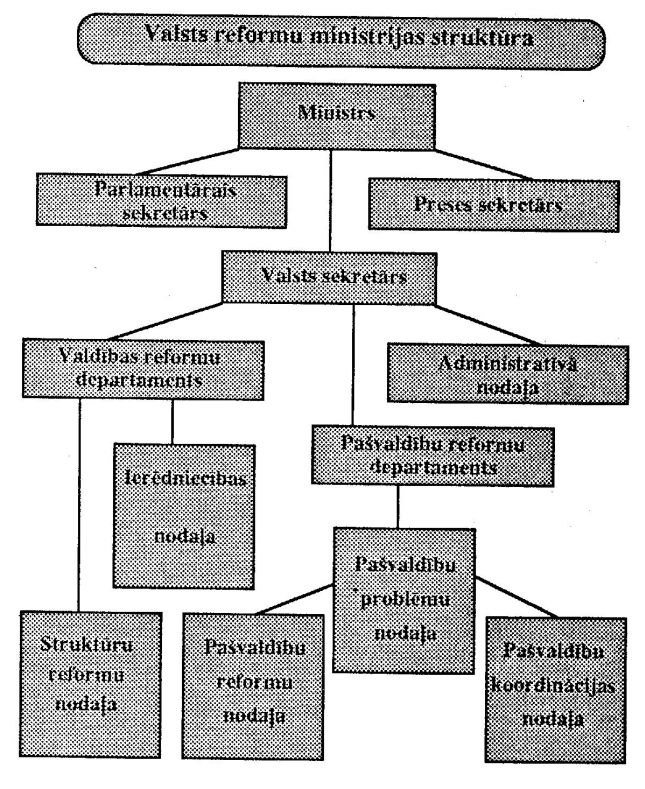 3. Valsts reformu ministrijas valsts sekretārs pēc saskaņošanas ar ministru nosaka ministrijas iekšējo struktūru (struktūras shēma pievienota), pamatojoties uz Saeimas akceptētajā «Deklarācijā par kabineta iecerēto darbību» izvirzītajiem mērķiem un šajā pagaidnolikumā noteiktajiem uzdevumiem, un apstiprina ministrijas centrālā aparāta štatus valsts budžetā noteikta štata vienību skaita un darba samaksas fonda ietvaros.