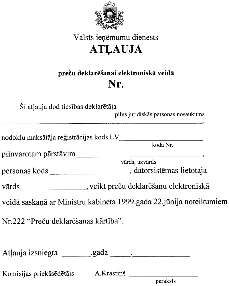 4. Apstiprināt formu atļaujai deklarēt preces elektroniski (2.pielikums).
