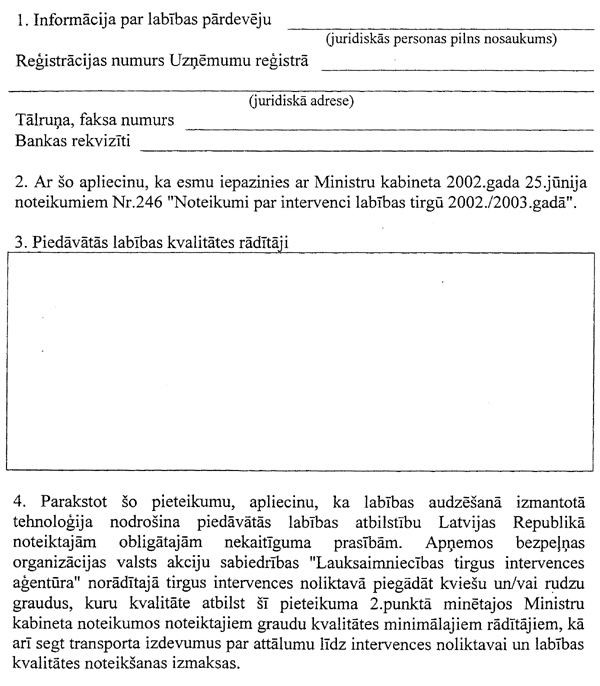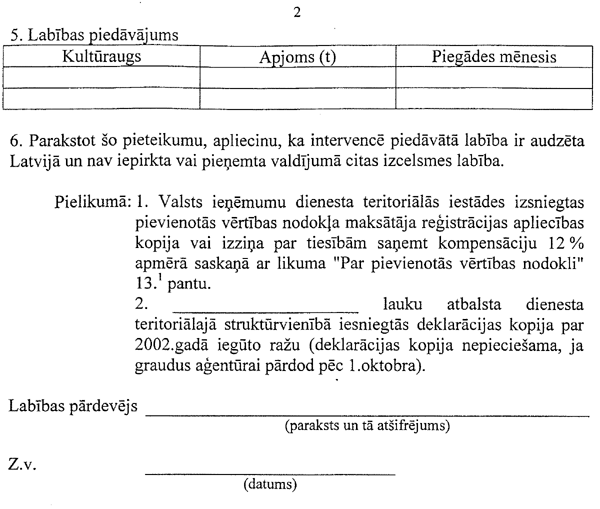 7. Lai pārdotu Latvijā audzētu labību intervencē, labības pārdevēji iesniedz aģentūrā pieteikumu labības pārdošanai (turpmāk — pieteikums). Pieteikumu iesniedz ne agrāk kā 15 dienas pirms pieteikumā norādītā pirmā piegādes mēneša (2.pielikums). Pieteikumā deklarējami piegādājamās labības apjomi, kvalitātes rādītāji un apstiprināma labības izcelsme. Pieteikumam pievieno tās deklarācijas kopiju, kura saskaņā ar likumu “Par Latvijas labības tirgu un valsts labības rezervi” līdz 1.oktobrim iesniegta Lauku atbalsta dienesta teritoriālajā struktūrvienībā (kooperatīvās sabiedrības iesniedz savu biedru deklarācijas).