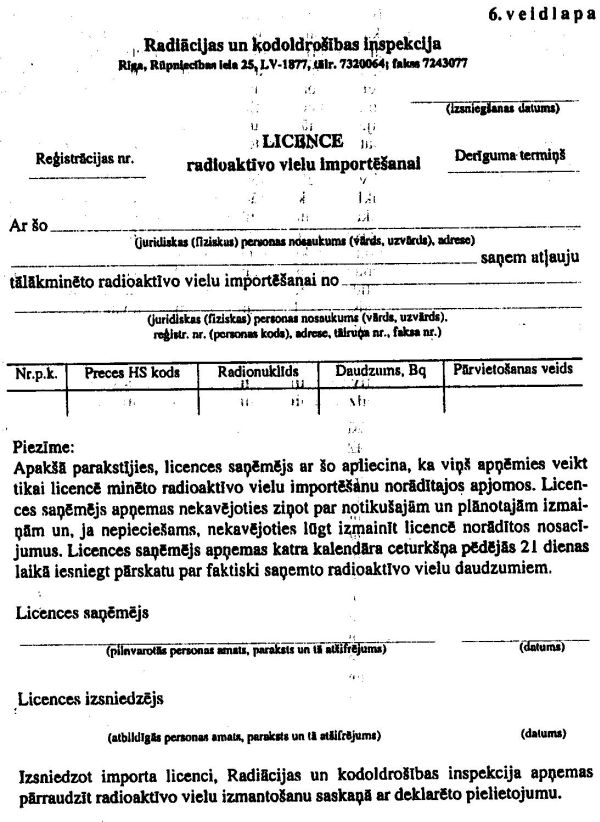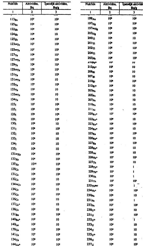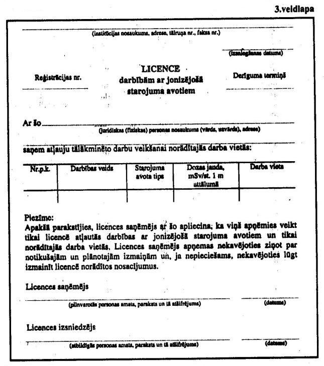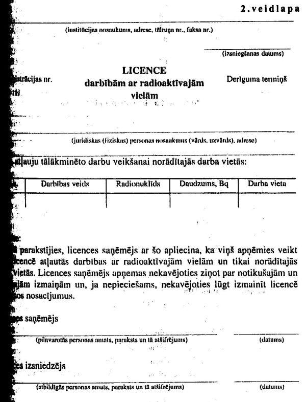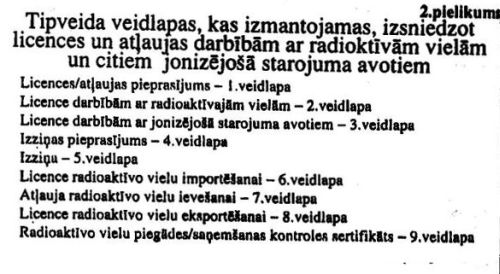 2. Jebkādai darbībai ar radioaktīvajam vielām, ja to aktivitāte pārsniedz šo noteikumu l pielikumā norādīto lielumu, un citiem jonizējošā starojuma avotiem, izņemot tās darbības, kas atzītas par izņēmumiem, nepieciešama licence uzņēmējdarbībai vai atļauja citām darbībām. Licenču un atļauju tipveida veidlapu paraugi — šo noteikumu 2.pielikumā.
