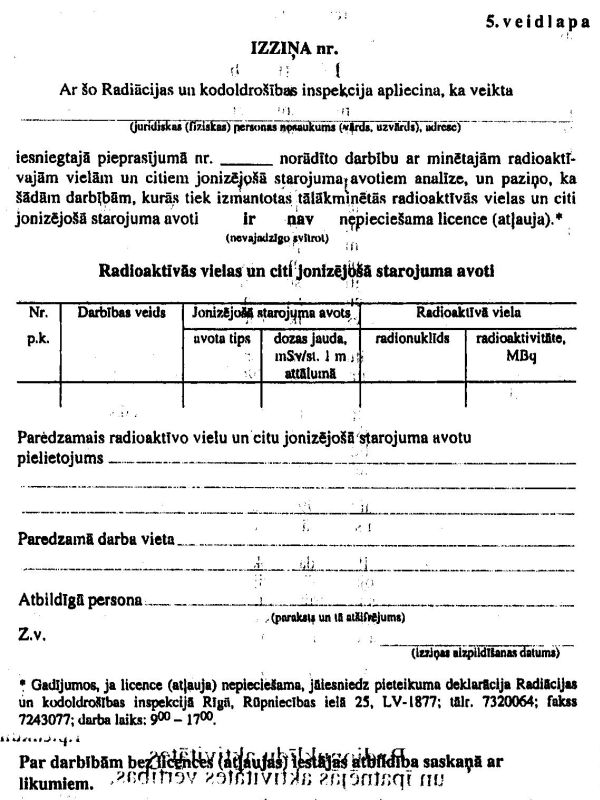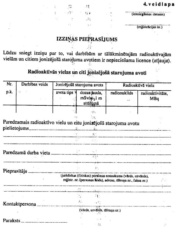 15. Ja persona vēlas ar radioaktīvajām vielām vai citiem jonizējošā starojuma avotiem veikt šo noteikumu 11 .pantā minētās darbības, tai ir iespēja saņemt izziņu, ka šādām darbībām licence vai atļauja nav nepieciešama. Izziņas pieprasījums (2.pielikuma 4. veidlapa) iesniedzams Radiācijas un kodoldrošības inspekcijai. Izziņa (2.pielikuma 5.veidlapa) ir derīga sešus mēnešus no tās izsniegšanas dienas.