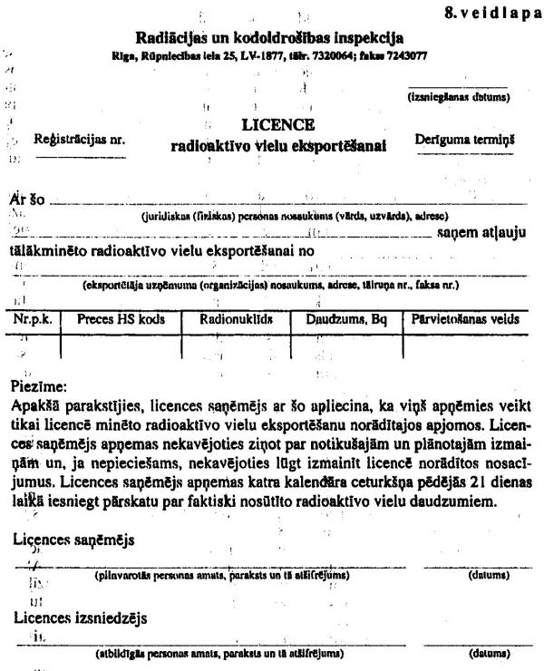 8. Lēmumu par licences vai atļaujas izsniegšanu radioaktīvo un kodolmateriālu eksportēšanai vai importēšanai (2.pielikuma 6., 7. un 8.veidlapa), ja tie nav ietverti Stratēģiskas nozīmes eksporta un importa kontroles komitejas apstiprinātajā divējāda lietojuma stratēģiskas nozīmes preču, produkcijas, pakalpojumu un tehnoloģiju sarakstā, ir tiesīga pieņemt tikai Radiācijas un kodoldrošības inspekcija.