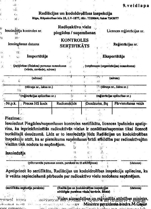 58. Personai, kas importē vai eksportē radioaktīvās vielas, 10 dienu laikā Radiācijas un kodoldrošības inspekcijai jāiesniedz kontroles sertifikāts (2.pielikuma 9.veidlapa) kā apstiprinājums tam, ka prece pārvietota pāri Latvijas Republikas valsts robežai.