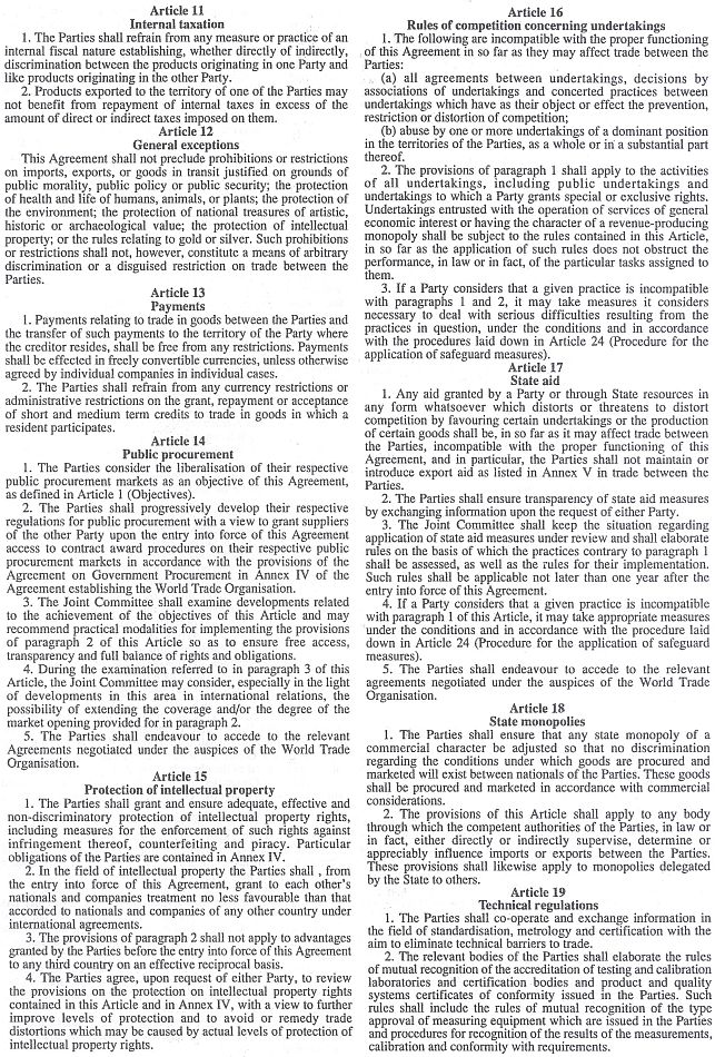 Šis līgums nekavē muitas ūniju, brīvo tirdzniecības zonu vai vienošanos par pierobežu tirdzniecību saglabāšanu vai nodibināšanu tādā mērā, ka tās negatīvi neietekmē tirdzniecību un it sevišķi šī Līguma noteiktos preču izcelsmes noteikumus.