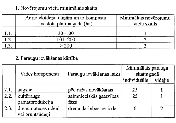 Notekūdeņu dūņu un to komposta izmantošanas vides monitoringa novērojumu vietu minimālais skaits un paraugu ievākšanas kārtība