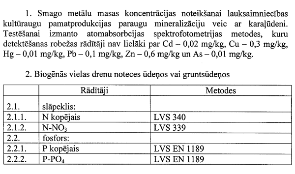 Lauksaimniecības kultūraugu pamatprodukcijā, drenu noteces ūdeņos vai gruntsūdeņos nosakāmo rādītāju testēšanas metodes