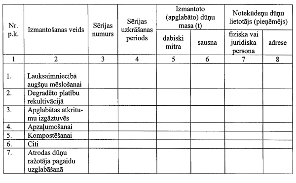 Pārskata gadā saražoto notekūdeņu dūņu sērijas Nr. _____ masa, kvalitāte un izmantošana (apglabāšana, izvietošana)