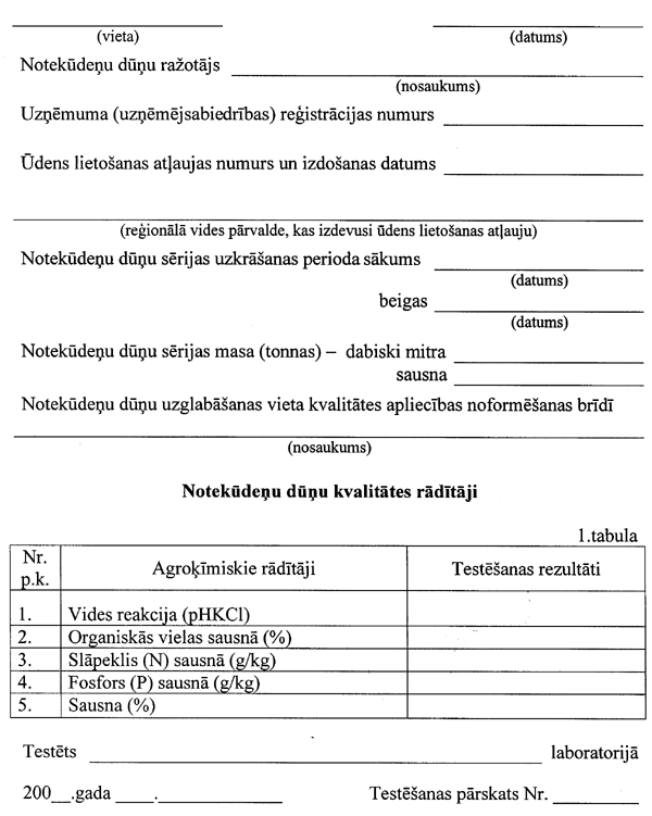 10. Notekūdeņu dūņu un to komposta ražotājs, pamatojoties uz iegūtajiem notekūdeņu dūņu un to komposta kvalitātes rādītājiem, katrai notekūdeņu dūņu un to komposta sērijai noformē notekūdeņu dūņu un to komposta kvalitātes apliecību (turpmāk – kvalitātes apliecība) saskaņā ar šo noteikumu 3. un 4.pielikumu. Kvalitātes apliecību noformē: