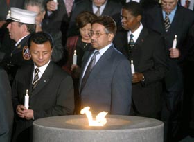 | Pasaules 92 valstu līderi, tostarp arī Latvijas Valsts prezidente (trešajā rindā pirmā no labās), piedaloties Mūžīgās uguns aizdegšanā Bateriparkā (augšējā attēlā); ar dzīvības svecītēm rokās: Kanādas premjerministrs Žans Kretjēns, ANO ģenerālsekretārs Kofi Annans, Ņujorkas mērs Maikls Blumbergs, ASV valsts sekretārs Kolins Pauels, Madagaskaras prezidents Marks Ravalomanana, Pakistānas prezidents Pervezs Mušarafs (vidējā attēlu rindā); Izraēlas ārlietu ministrs Šimons Peress, Krievijas ārlietu ministrs Igors Ivanovs, Afganistānas prezidents Hamids Karzai (abās apakšējās attēlu rindās) |