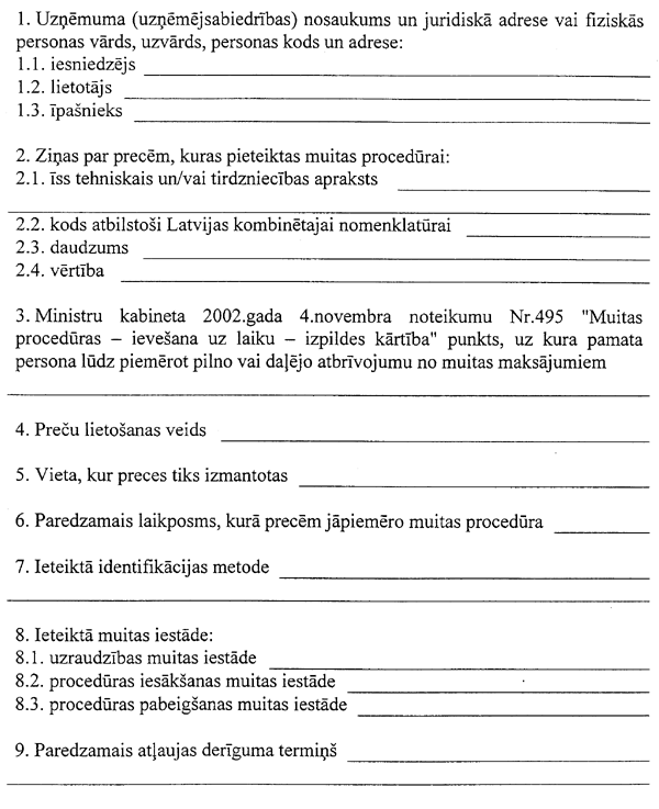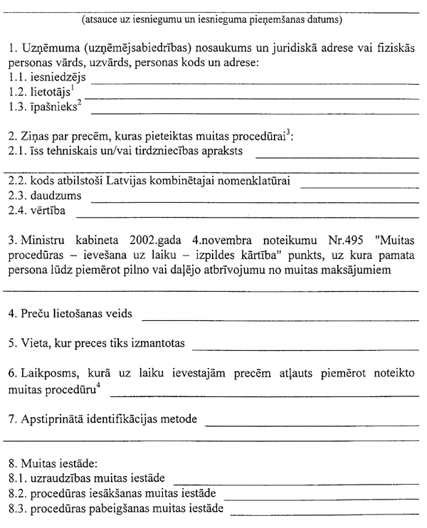 7. Lai saņemtu atļauju preču ievešanai uz laiku (turpmāk — atļauja), persona, kas izmanto šīs preces vai uzņemas atbildību par to turpmāku izmantošanu, iesniedz iesniegumu atļaujas saņemšanai (turpmāk — iesniegums) (1.pielikums) Valsts ieņēmumu dienesta teritoriālajā muitas iestādē (turpmāk — muitas iestāde), kuras teritorijā attiecīgās preces paredzēts izmantot. Atļauju noformē atbilstoši šo noteikumu 2.pielikumā noteiktajam paraugam.