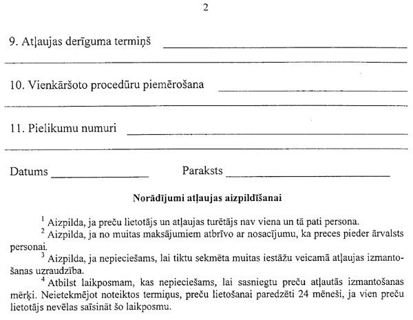 11. Atļauju izsniedz trijos eksemplāros. Vienu atļaujas eksemplāru izsniedz iesnieguma iesniedzējam, otru atļaujas eksemplāru triju dienu laikā nosūta tai Valsts ieņēmumu dienesta rajona nodaļai, kurā persona reģistrēta kā nodokļu maksātājs. Trešais atļaujas eksemplārs paliek muitas iestādē, kura ir izsniegusi atļauju.