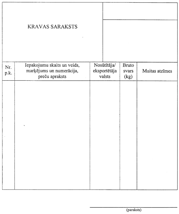 2. Veidlapai izmanto tikai vienu lapas pusi. Aizpildot veidlapu, katram kravas sarakstā norādītajam preču veidam piešķir savu kārtas numuru (aile “Nr.p.k.”). Ja nepieciešams, pie katra preču veida norāda papildu atzīmes par īpašām prasībām (piemēram, licencētām precēm), kuras noteiktas normatīvajos aktos. Zem pēdējā preču veida norādes kravas sarakstā novelk horizontālu līniju un atlikušo veidlapas daļu pārsvītro, lai novērstu tās papildināšanu vēlāk.
