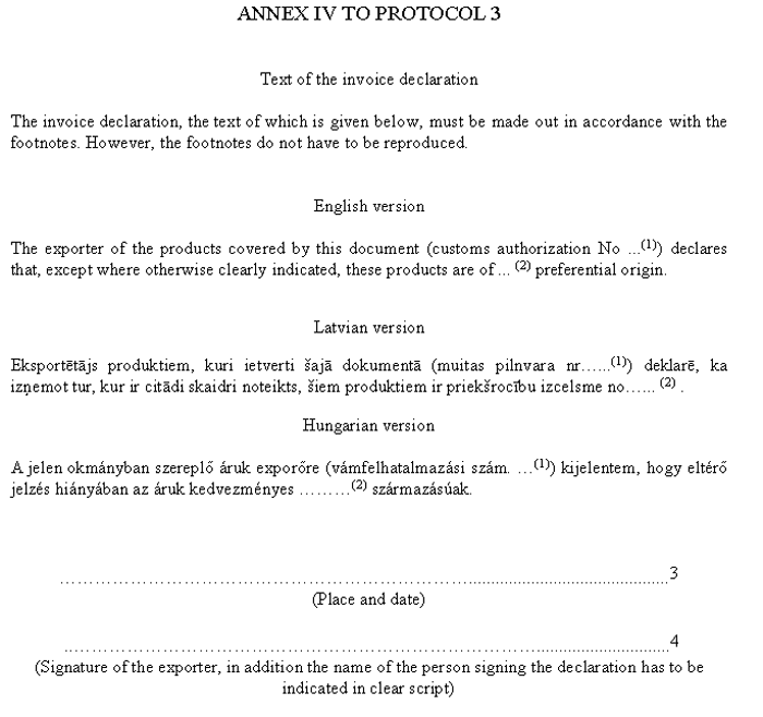 Annex IV: Text of the invoice declaration