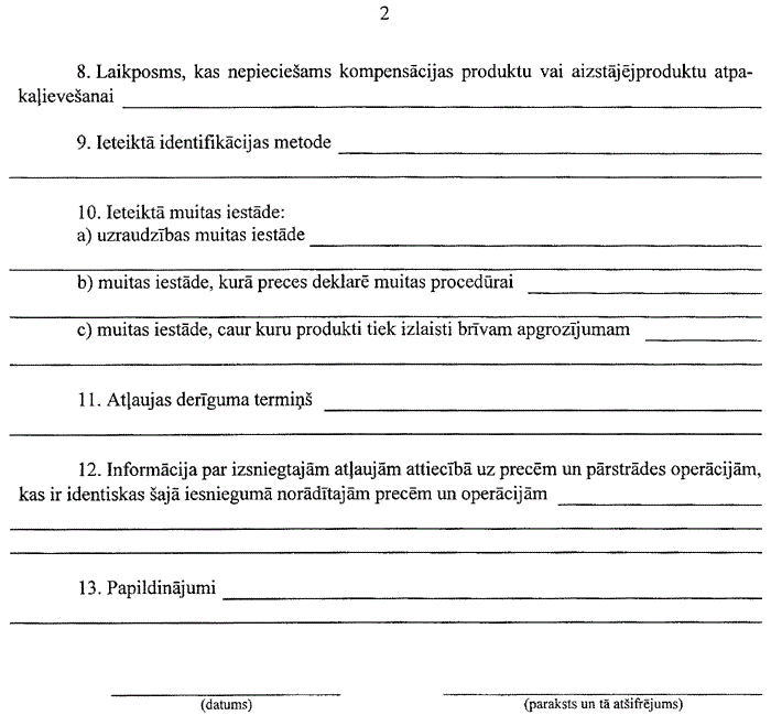 14. Veidlapas 8.punktā sniedz informāciju par preču noteiktu daļu (piemēram, vienību). Norāda laikposmu, kas pēc preču izvešanas nepieciešams kompensācijas produktu atpakaļievešanai vai aizstājējproduktu ievešanai. Šāda informācija nav jāsniedz, ja paredzēts piemērot preču apmaiņas kārtību ar iepriekšēju ievešanu.