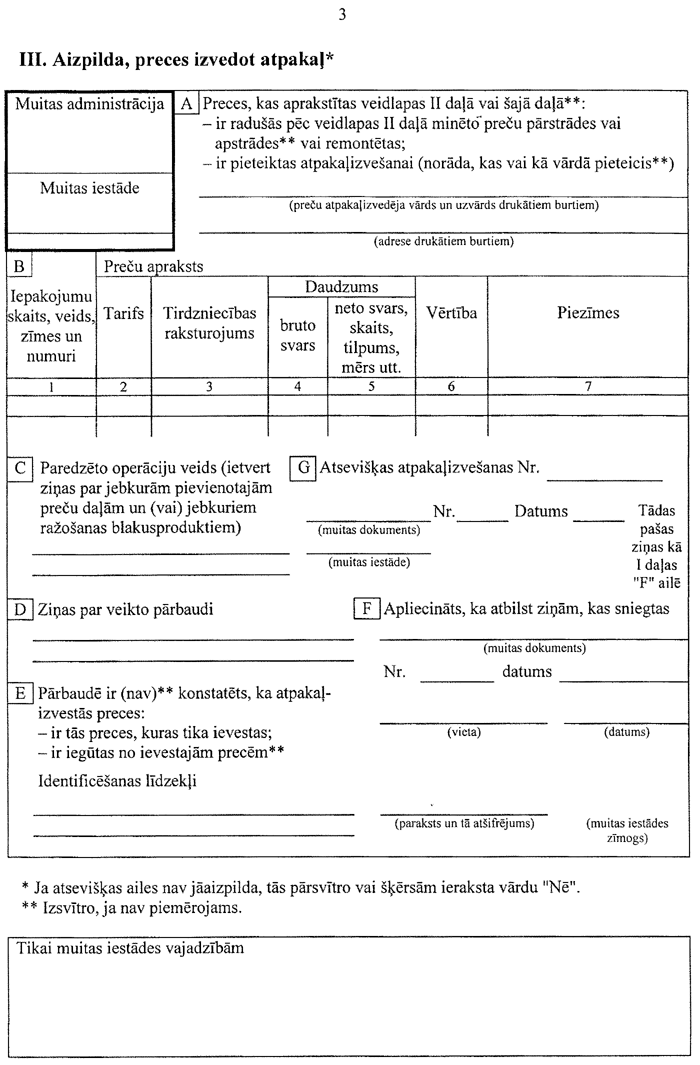 3.3.1. preču atpakaļizvedējs aizpilda dokumenta papildu III daļu (ieskaitot “G” aili) un kopā ar dokumenta I un II daļu uzrāda to muitas iestādē;