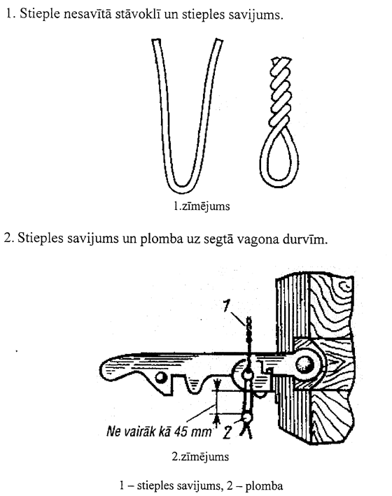 29. Segtajam vagonam savijuma stiepli izvada caur durvju aizliktņa un vagona statņa dzinteles savietotajām atverēm, stieples abus galus ievieto speciālā metāla plāksnītē, ar kuru savij stiepli visā garumā (1.pielikuma 2.zīmējums). Pēc stieples savīšanas atlikušos nesavītos stieples galus nogriež. Tādā pašā veidā savijumu uzliek izotermiskā vagona durvju apakšējā daļā.
