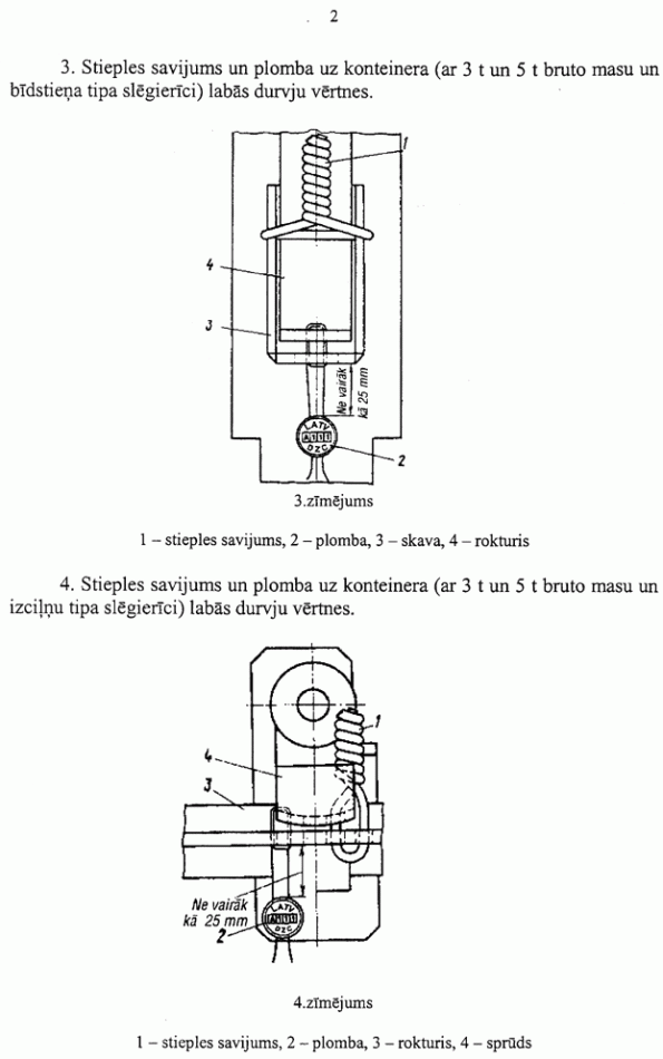 33. Konteineriem ar 3 t un 5 t bruto masu un bīdstieņa tipa slēgierīci stiepli izvada caur horizontāli izvietotajām atverēm skavā, kurā ievietots rokturis, un savij uz augšu līdz galam (1.pielikuma 3.zīmējums).