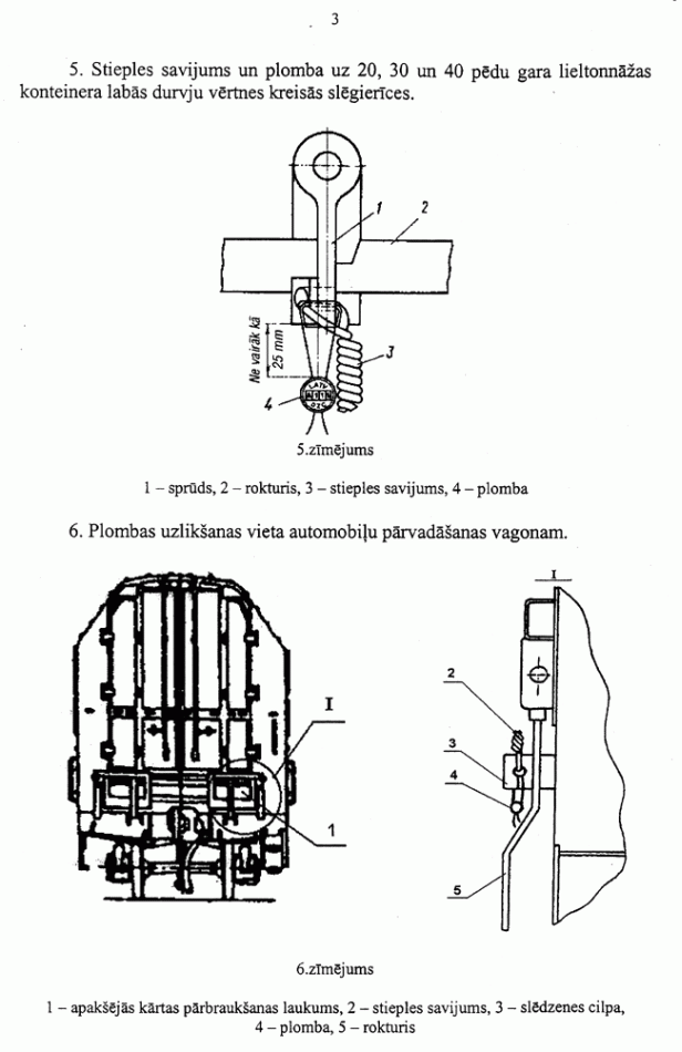 55. Plombējot vagonus, plombēšanas stiepli divas reizes izver caur plombu uzlikšanai paredzēto vagona ierīču savietotajām atverēm. Plombējot konteinerus, plombēšanas stiepli divas reizes izver caur atverēm rokturī un bīdstieņa tipa slēgierīces skavā vai caur atverēm rokturī un izciļņu tipa slēgierīces noslēgtu sprūdu.