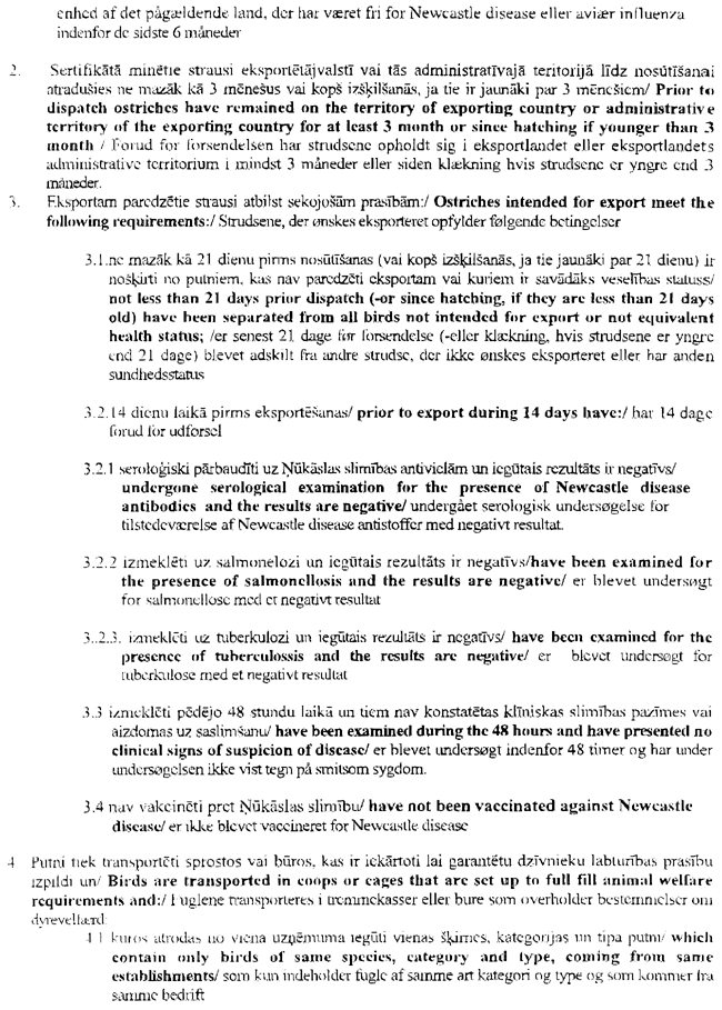 2. Sanitārajai robežinspekcijai kontrolēt veterinārā (veselības) sertifikāta šķirnei un audzēšanai paredzētu strausu ievešanai Latvijas Republikā no Dānijas atbilstību rīkojuma pielikumā noteiktajam paraugam.
