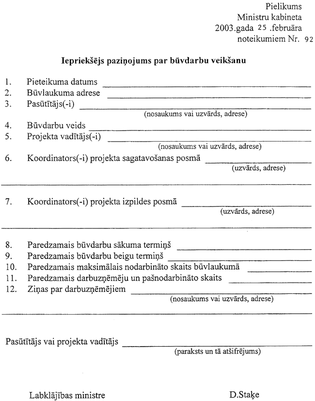 12. Pasūtītājam vai projekta vadītājam ir pienākums pirms būvdarbu uzsākšanas nosūtīt Valsts darba inspekcijai iepriekšēju paziņojumu par būvdarbu veikšanu (pielikums) vienā no šādiem gadījumiem: